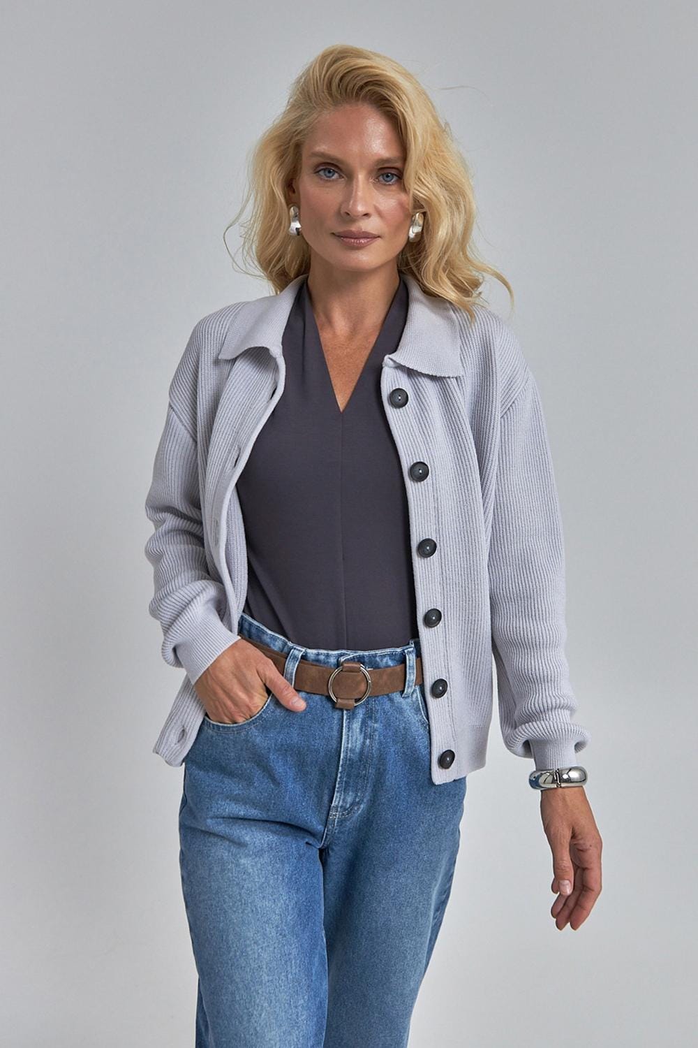 Trendy cardigan crafted from premium merino wool and alpaca yarn. The dense knit provides structure while remaining soft and comfortable for everyday wear. Front accent buttons add a refined touch.