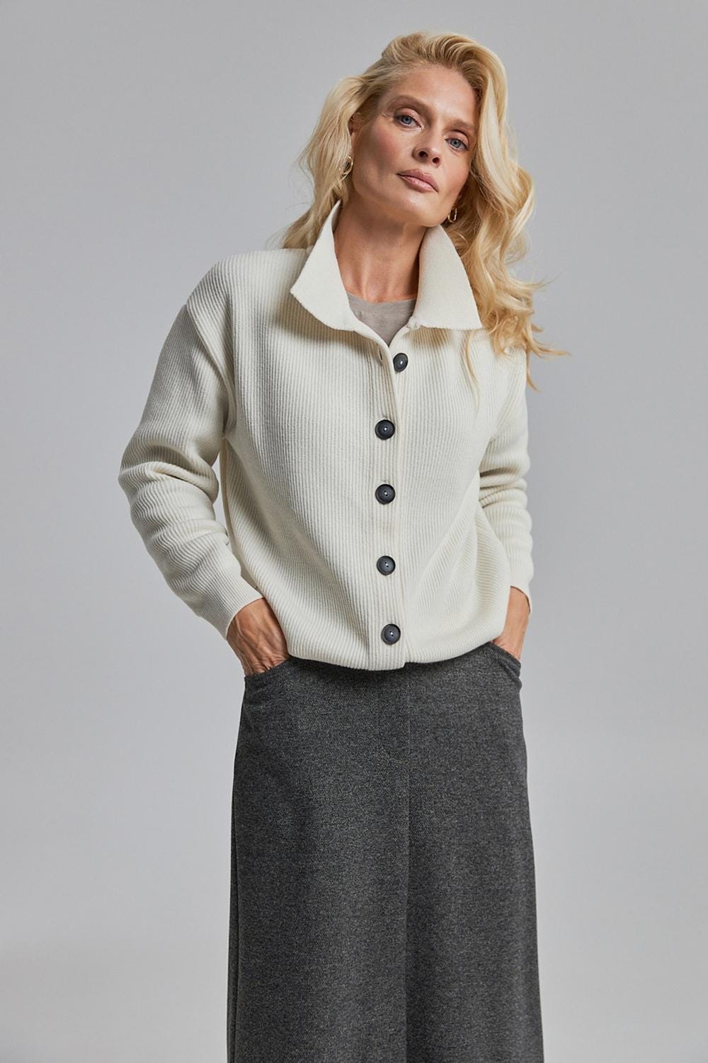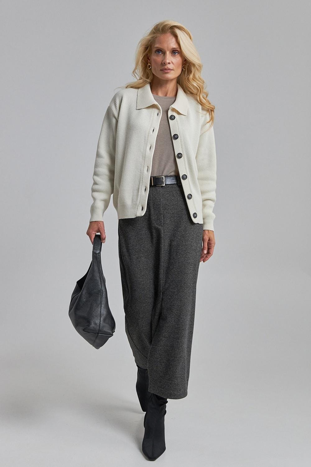 Available in Ivory and Misty Gray — both versatile, elegant shades that pair effortlessly with minimalist and capsule wardrobes.