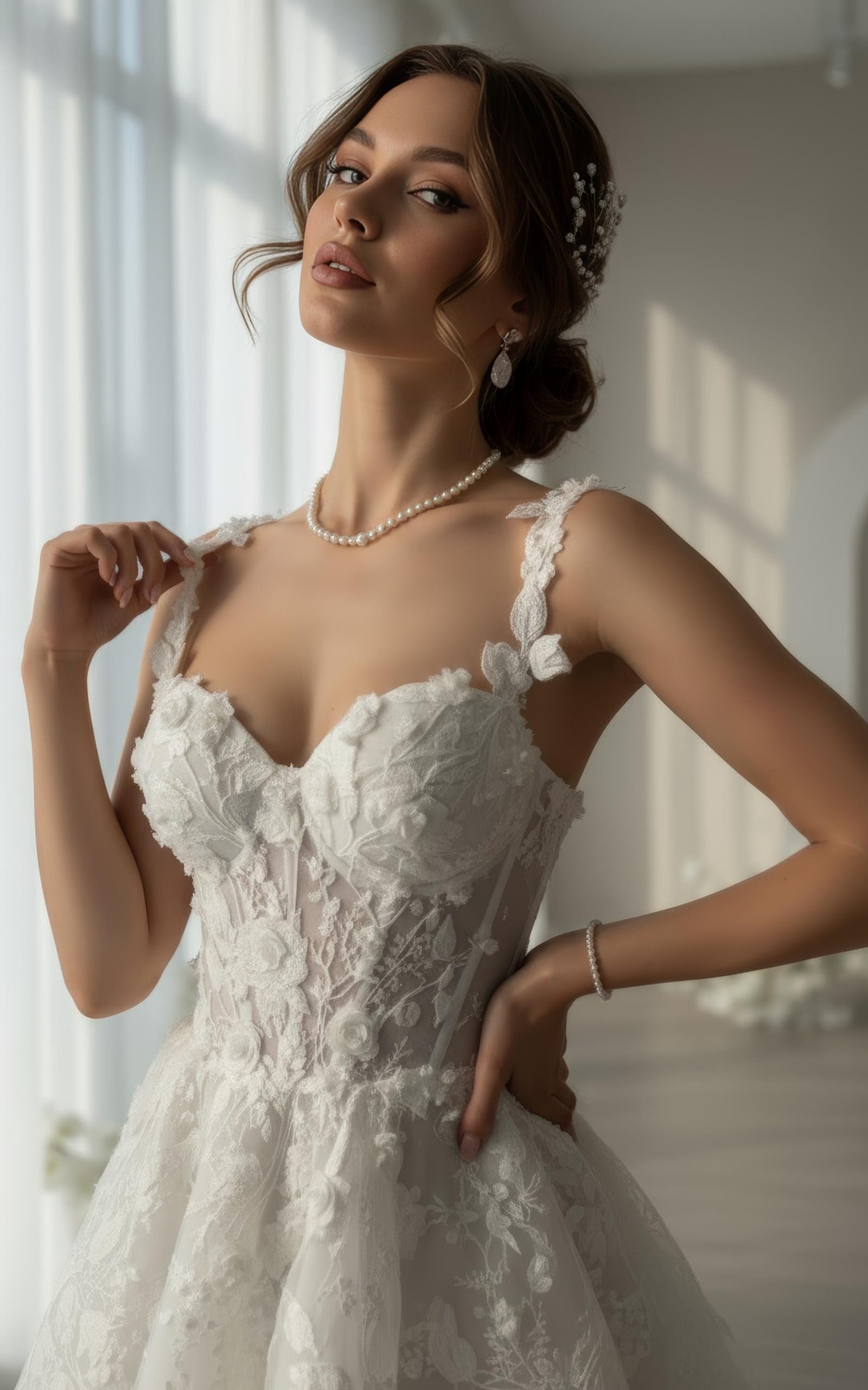 ASHÉOR luxury handmade pearl bridal dress ✨ short or long option, elegant strapless design, perfect wedding gown for modern brides.