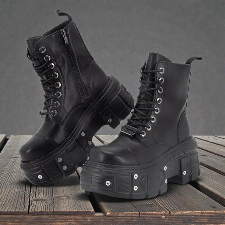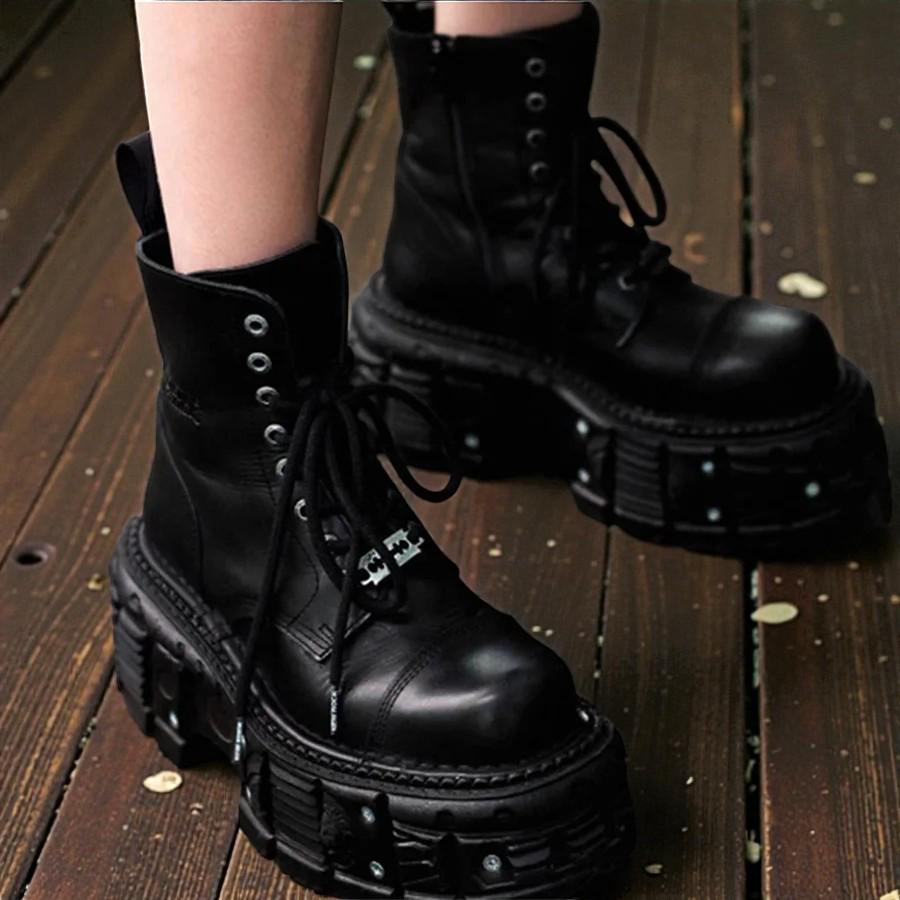 Step into bold punk style with these handmade women s platform ankle boots, designed with a round toe, lace-up closure, and sturdy wedge heel. Made from durable PU materials and built with a solid 3 5 cm platform, these motorcycle-inspired boots offer comfort, attitude, and all-day stability. Perfect for spring and autumn outfits, they deliver a statement look for streetwear, concerts, and edgy everyday fashion.