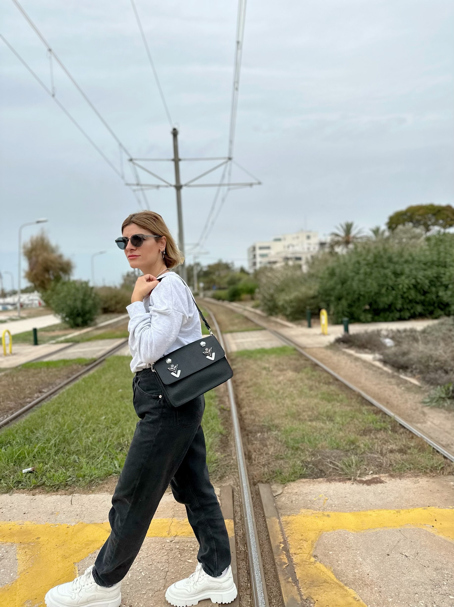 A Black Leather Shoulder Bag for Women that is made from full grain leather, is decorated with some tiny silver buckles and crystals, that create a really special boho result. The shape of the bag is rectangular in small to medium dimensions,and the interior is single and spacious with a zipper pocket at the back side that gives extra comfort. Find it only at us Store.