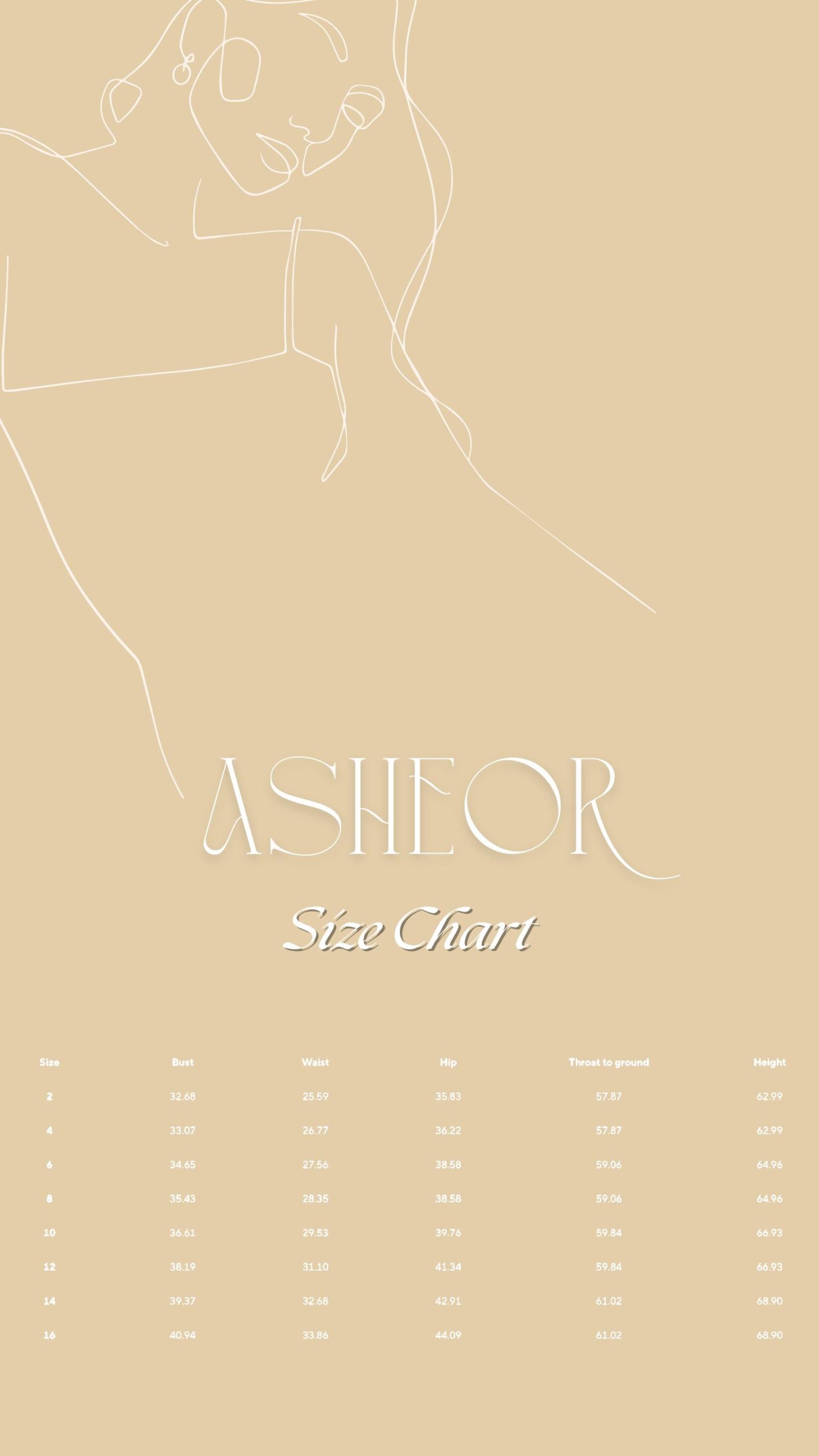 Size 2 – Bust: 32.68 in / 83 cm | Waist: 25.59 in / 65 cm | Hip: 35.83 in / 91 cm | Throat to ground: 57.87 in / 147 cm | Height: 62.99 in / 160 cm