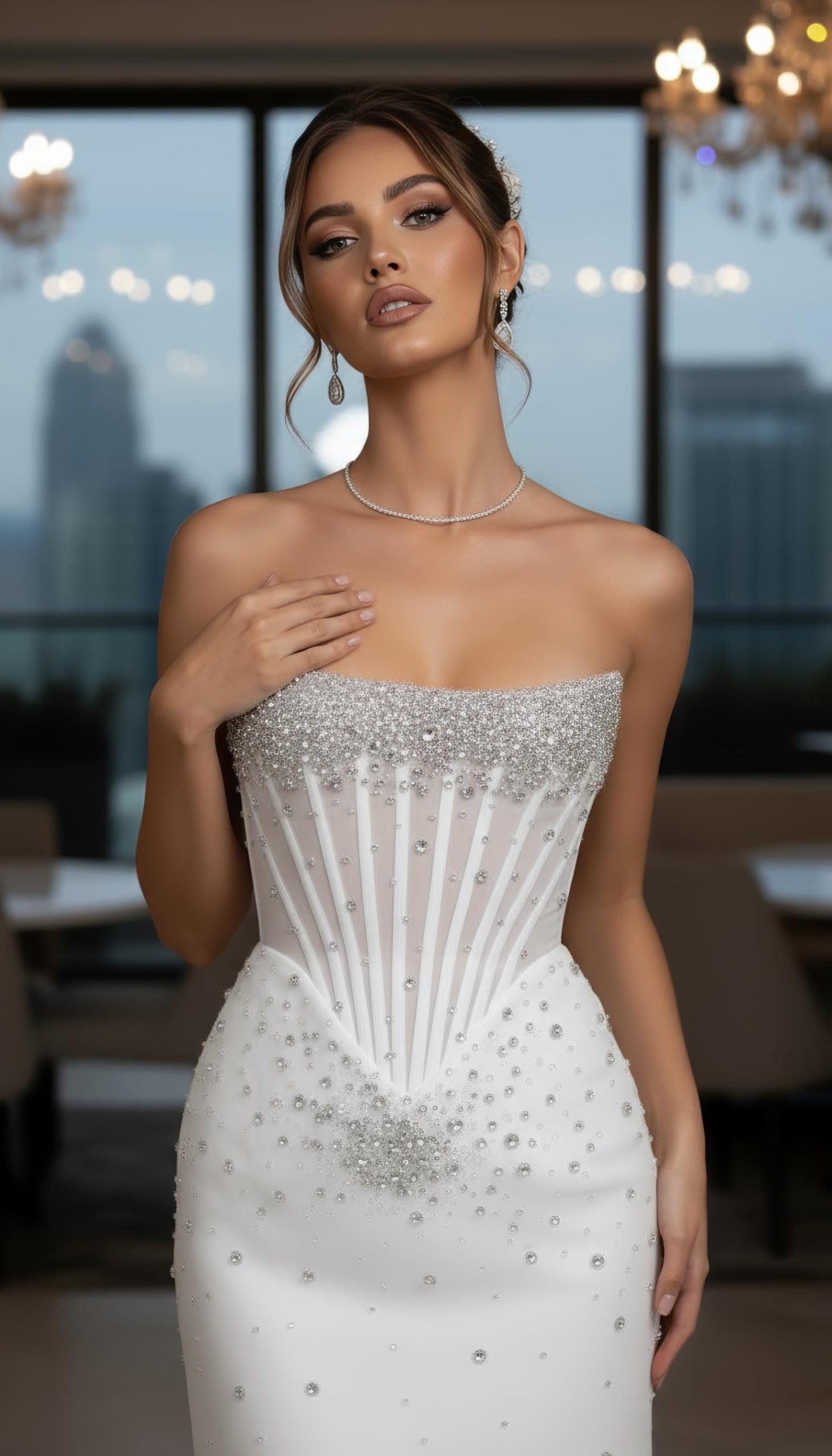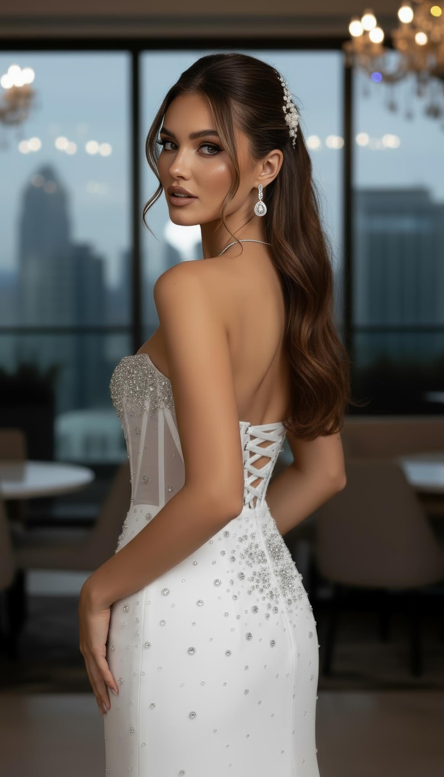 Its sleek strapless silhouette and lace-up back offer a flattering, custom-fit finish — perfect for your wedding reception, engagement party, or elegant evening event.
