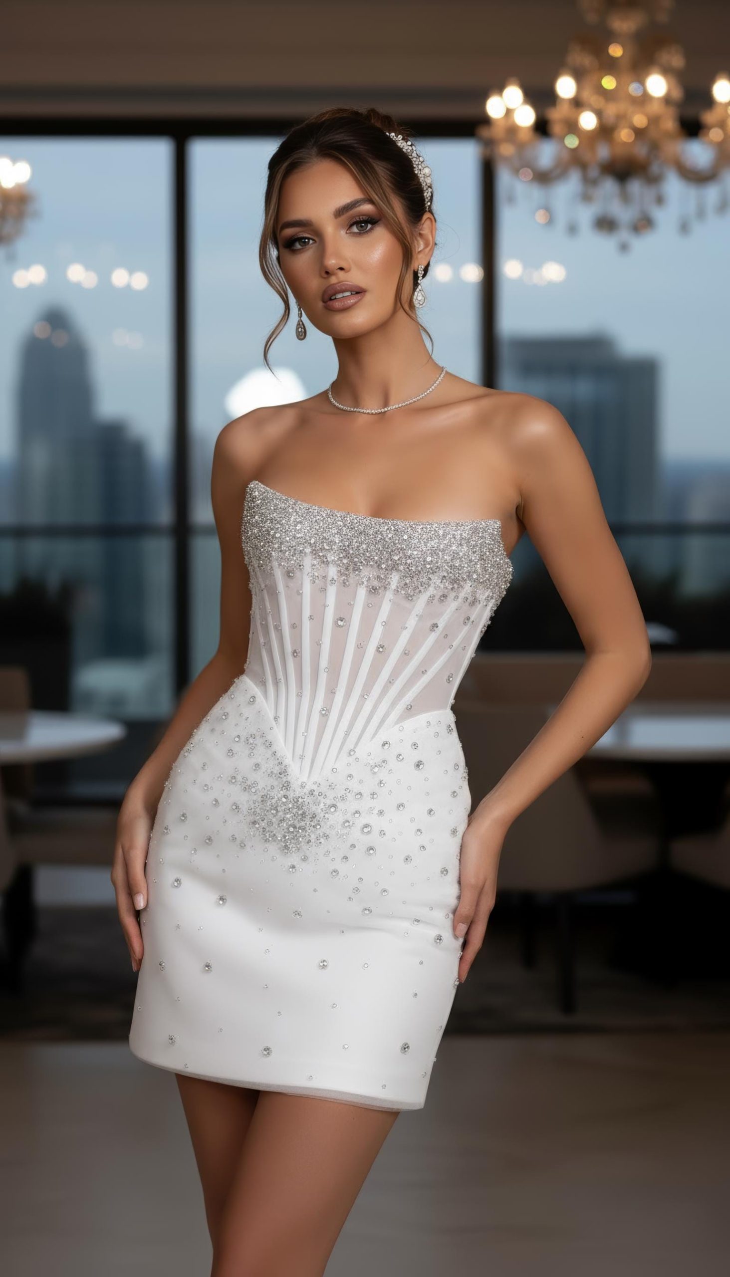 Handmade Rhinestone Corset Mini Dress: Strapless Bridal Gown