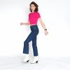 This pair of jeans features a mini flare, high rise, ankle-grazer, unfinished hem,& stretched fabric, five-pocket construction, belt loops, front zip, and metal button closure.