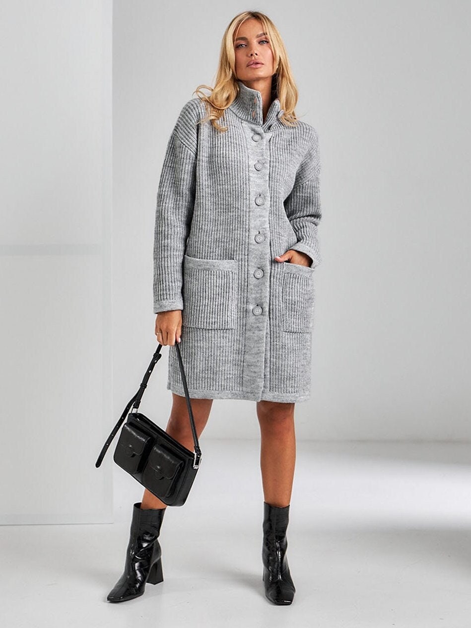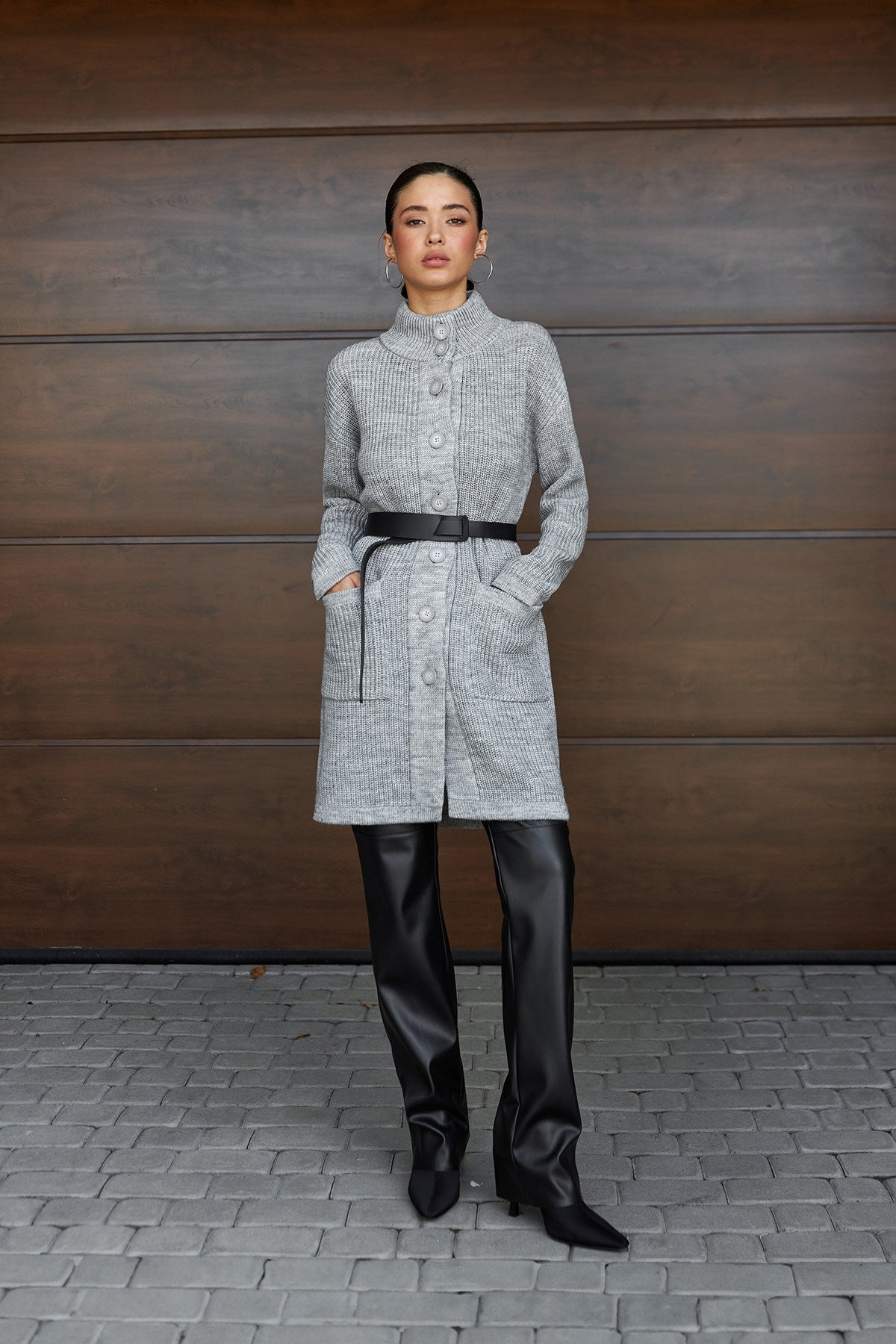 Stylish cardigan made of semi-woolen yarn. Warm and pleasant to the body. Dense knitting, elastic weave. An ideal product in cold weather.