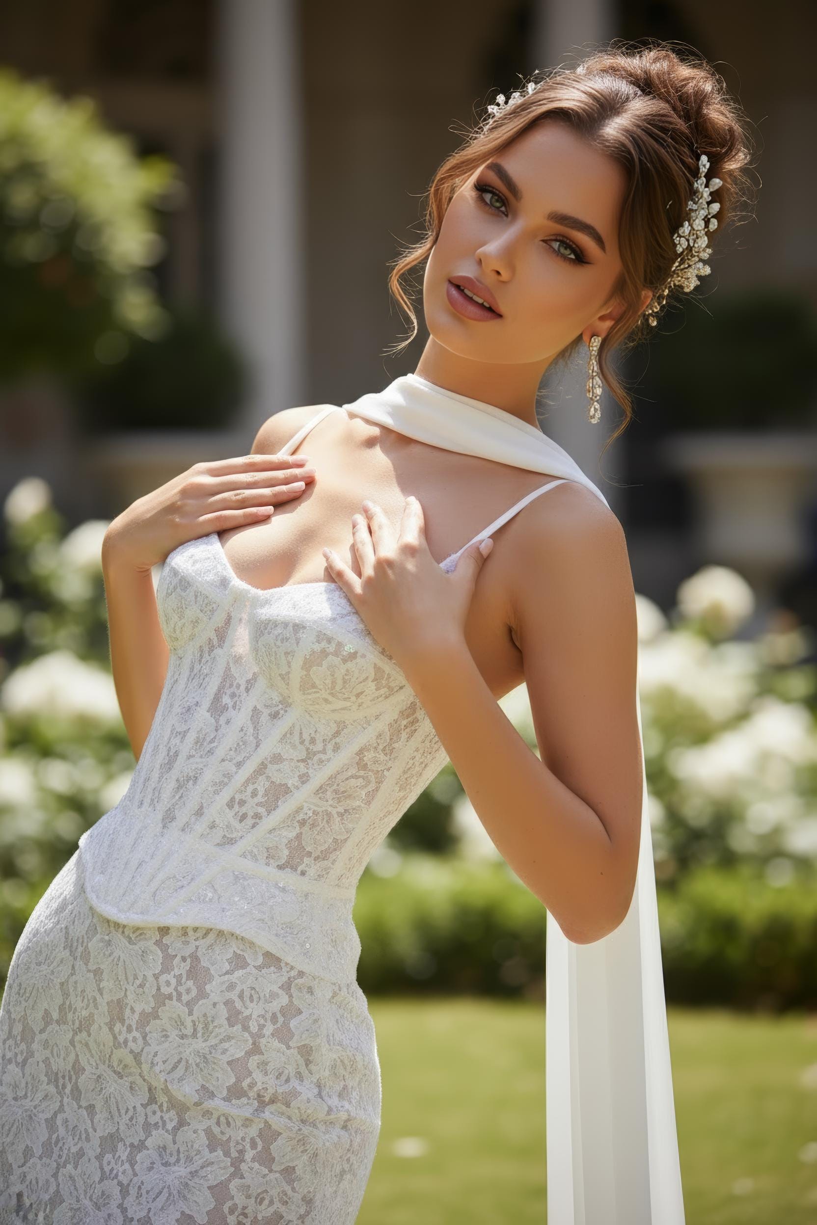 The sheer lace bodice with corset boning sculpts the figure, while the flowing chiffon scarf train adds ethereal movement and grace.