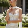 With its fitted silhouette, spaghetti straps, and subtle shimmer, this gown is ideal for modern brides, garden weddings, or receptions under the stars.