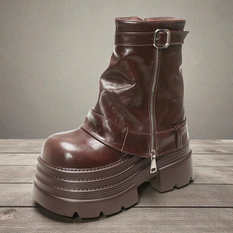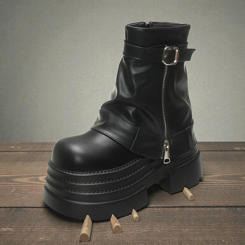 Add bold elegance to your look with these handmade British-style ankle motorcycle boots, crafted with a sleek round toe, super-high wedge heel, and striking metal accents. Built with durable PU material and a stable 3 5 cm platform, these boots offer a perfect blend of height, comfort, and edgy style. The zip closure ensures easy wear, while the soft Lycra lining makes them ideal for spring and autumn outfits, streetwear, and fashion-forward everyday looks.