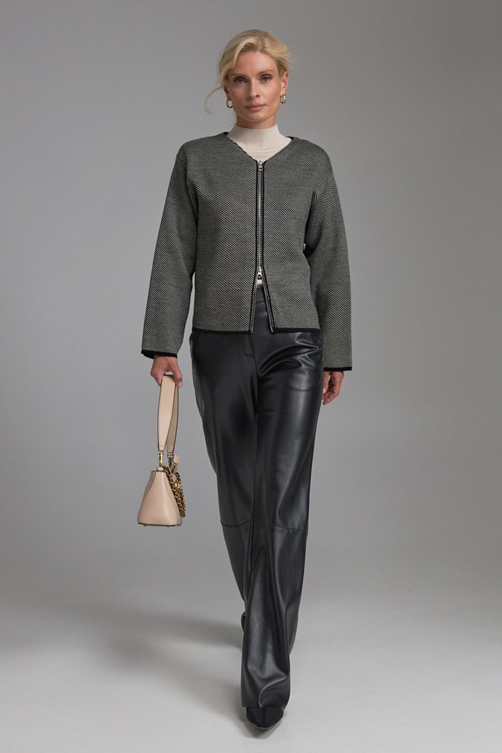 Pair with wide-leg trousers, leather pants, or a lightweight turtleneck for a modern, minimal, elevated look. Works perfectly for office, travel, and everyday smart-casual outfits.