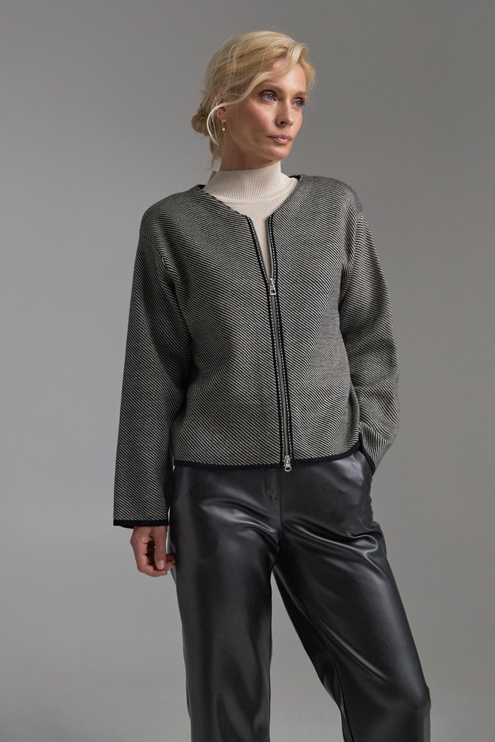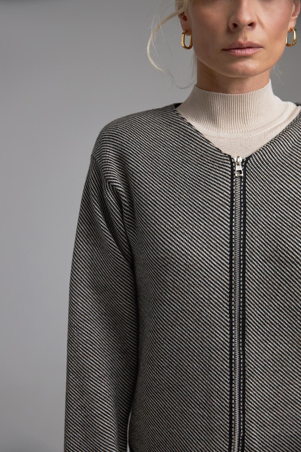 The dense textured knit keeps its shape beautifully, while the full-length zipper adds a sleek, functional touch. Perfect for effortless smart-casual outfits, office layering, or elevated daily looks.